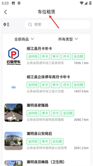 2、車位租賃頁,展多地車位月年卡,標位置距離,支持類型篩選,提供綏江等車位租賃選項,適配長時停車需求。
