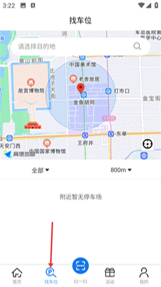 3、找車位頁,基于地圖定位查周邊停車場,支持搜索篩選,當前定位區域附近暫無停車場,需調整范圍。