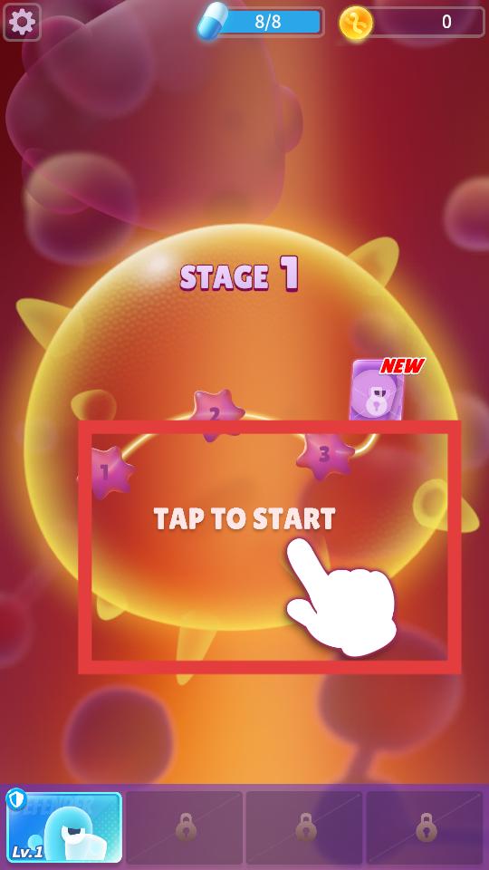 1、點擊屏幕就能開始,進入第一關,操控角色在充滿泡泡的場景中行動,準備應對來襲的敵人,開啟關卡挑戰。