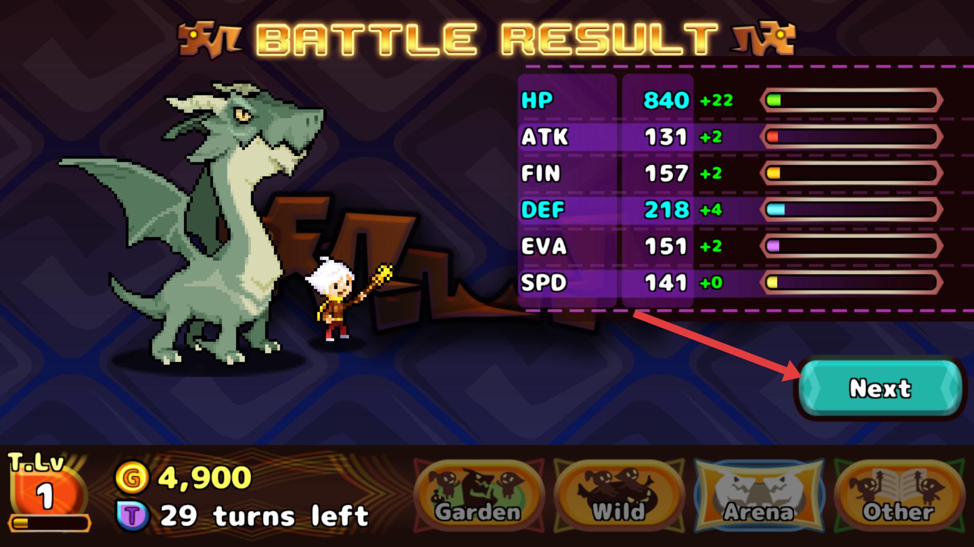 4、領取獎勵后,查看角色與龍的屬性提升情況,點擊【Next】,繼續下一段游戲旅程。