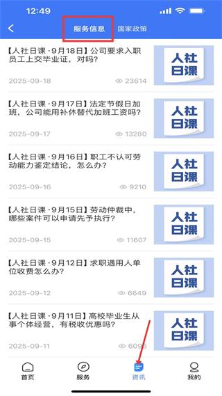 3、資訊頁服務信息板塊推送人社日課內容,解答職場勞動權益等常見問題,幫助用戶了解實用人社知識。