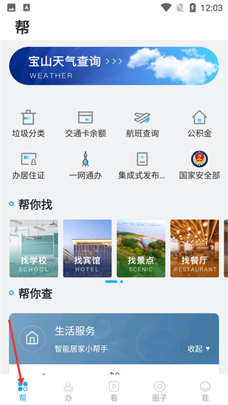 1、幫頁有寶山天氣查詢,提供垃圾分類、交通卡余額等服務,還有找學校、賓館等幫你找板塊,底部是幫入口。