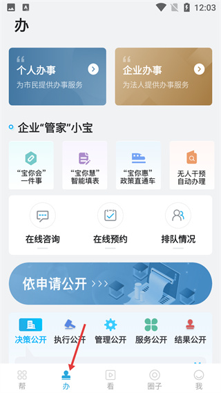 2、辦頁分個人和企業辦事,有智能填表、政策直通車等企業服務,還有在線咨詢、預約功能,底部是辦入口。