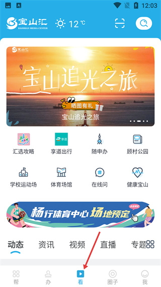 3、看頁展示寶山追光之旅活動,有匯選攻略、享道出行等入口,還有動態、資訊等板塊,底部是看入口。