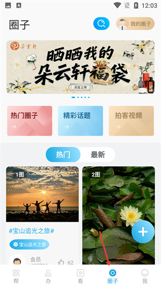 4、圈子頁有熱門圈子、精彩話題分類,展示用戶分享的寶山追光之旅等內容,底部是圈子入口。