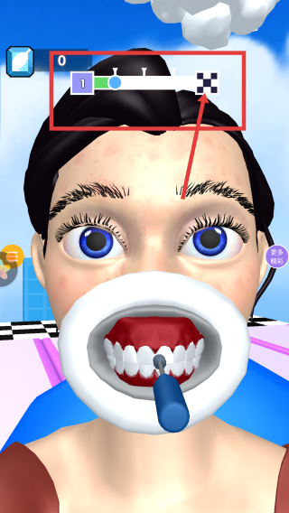 2、本輪是進行牙齒清潔操作,要關注上方進度條,通過操作讓進度條上的藍色圓點向黑白格子終點推進,完成牙齒清潔任務向下一關前進。