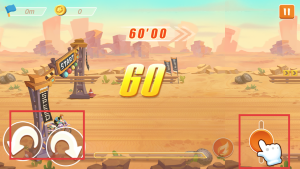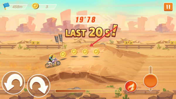 2、進入游戲后利用屏幕左側的左右轉向按鈕控制摩托車方向,右側的橙色油門按鈕控制加速,保持摩托車平衡,順利通過各種地形。