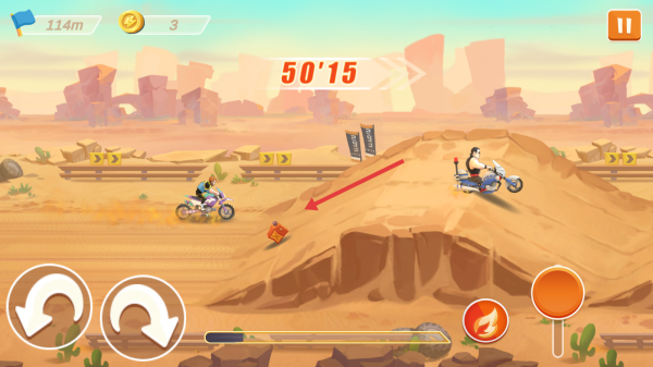 3、賽道上會出現道具看到道具時,及時操控摩托車收集,獲取短時間的加油效果,超越對手或更快通過賽道。