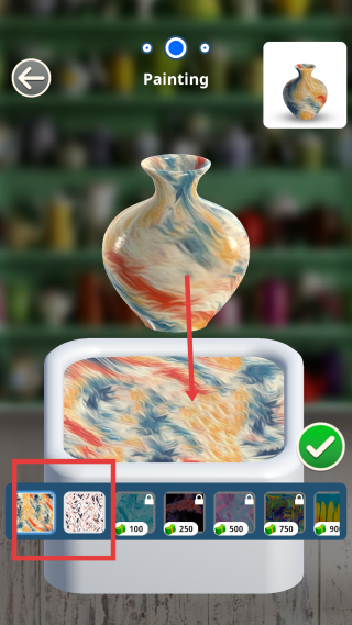 3、在繪畫環節從下方可選的圖案中選擇喜歡的,將其應用到花瓶上,為花瓶增添色彩和紋理,完成后點擊綠色對勾。