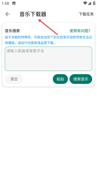 4、在音樂下載器頁面,輸入歌曲或歌手名即可搜索音樂,支持無損音質下載,若遇加密問題可切換高清品質獲取資源。