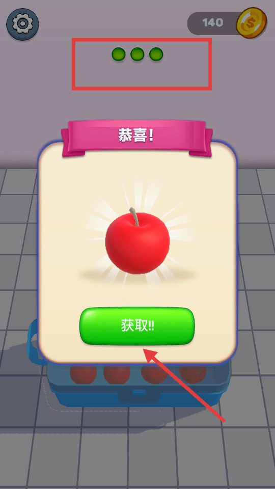 3、當完成果實收集等任務后,會彈出恭喜的提示框,里面有紅色蘋果圖案,點擊綠色獲取按鈕領取相應獎勵。