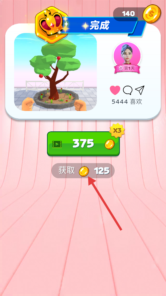 4、成功培育果樹并完成相關操作后,關卡顯示完成可獲取金幣獎勵,點擊獲取按,領取對應的金幣,用于后續解鎖化妝游戲內容。