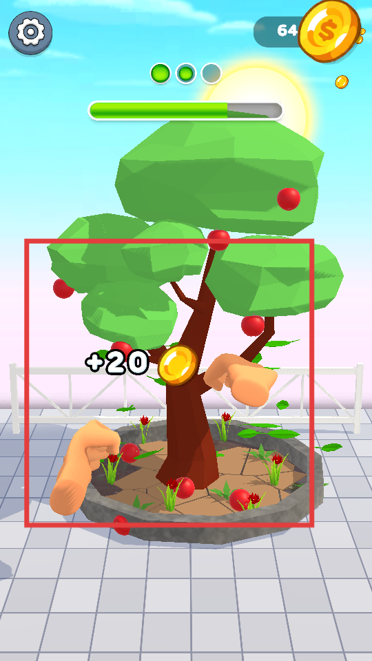 2、小樹長大后會結出紅色果實,點擊果實進行捶打收集,收集過程中能獲得金幣獎勵,多收集果實積累更多金幣資源。