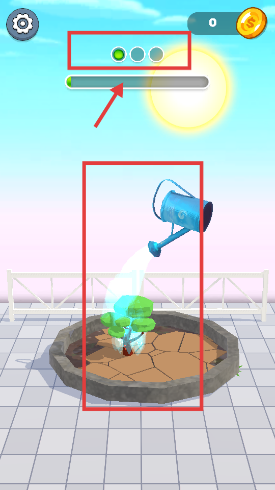 1、游戲開始用藍色水壺給小樹澆水,隨著澆水上方進度條會推進,要持續澆水讓小樹逐漸生長,這是培育果樹的第一步。