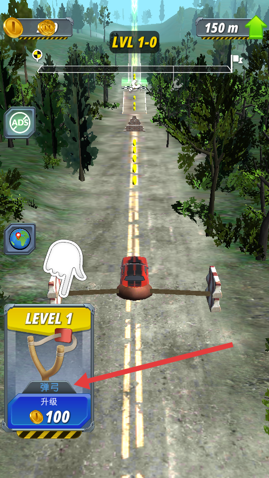 4、獲得金幣后可點擊升級按鈕,花費金幣升級彈弓,提升玩家彈弓性能,讓后續發射賽車時能有更好的表現,助力更遠行駛距離。