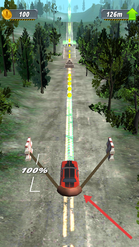 1、游戲開始時拉動彈弓至力度達百分之百,瞄準道路中間的金幣和綠色的加速帶發射紅色賽車,借助加速帶提升速度,盡可能讓賽車朝著終點方向沖刺。