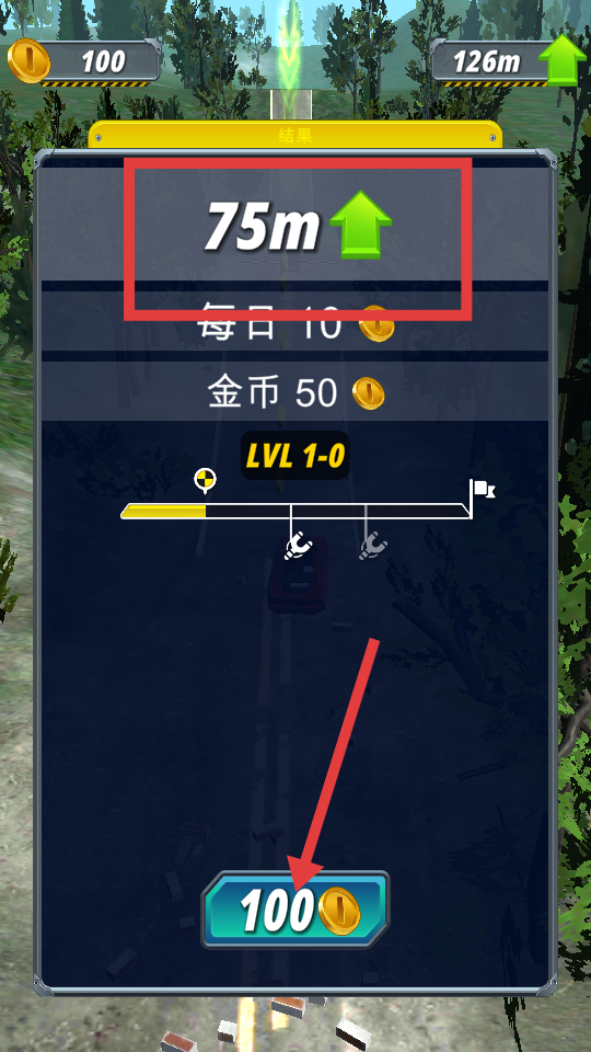 3、賽車行駛結束后,會顯示行駛距離等結果,點擊帶有金幣的按鈕,領取相應的金幣獎勵,積累金幣用于后續升級等操作。