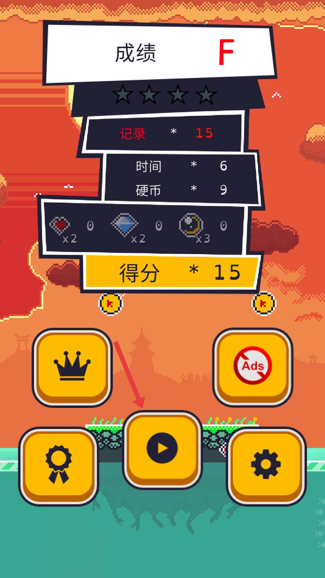4、游戲結束后,會顯示成績等信息,若想再次挑戰,點擊中間播放按鈕,重新開始游戲,爭取更好成績。