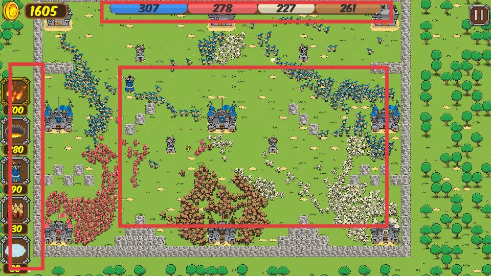 4、戰斗時左側有不同技能,如火焰技能能發生火焰彈消滅敵人等,可根據戰場情況使用,同時要關注上方各方兵力數值,合理部署部隊爭奪中間區域優勢。
