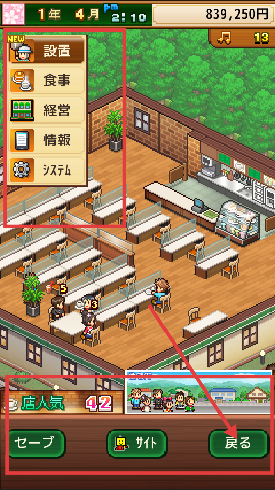 3、在咖啡店經營界面有設置、食事等功能選項,可根據需求點擊操作,同時要關注店人氣數值,點擊右下角可返回主操作界面管理店鋪。