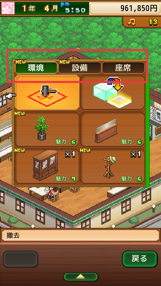4、打開設置相關界面,有環境、設施、座席等分類,可在這些分類下選擇合適的物品,如植物、展示柜等,布置咖啡店提升店鋪魅力。