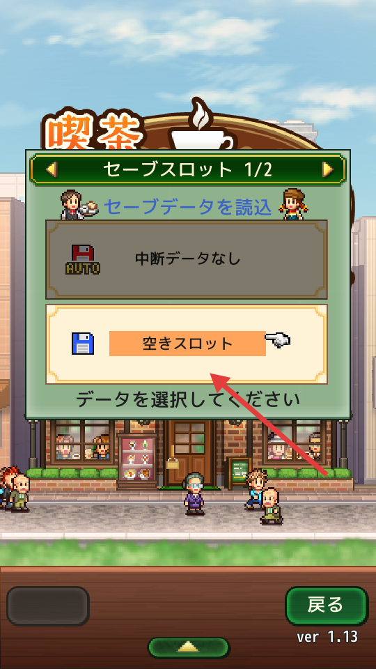 2、進入存檔選擇界面,能看到一些指引提示,若要開始新游戲選擇箭頭所指處的空閑空間,就能進入新的游戲存檔開展經營。