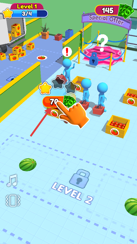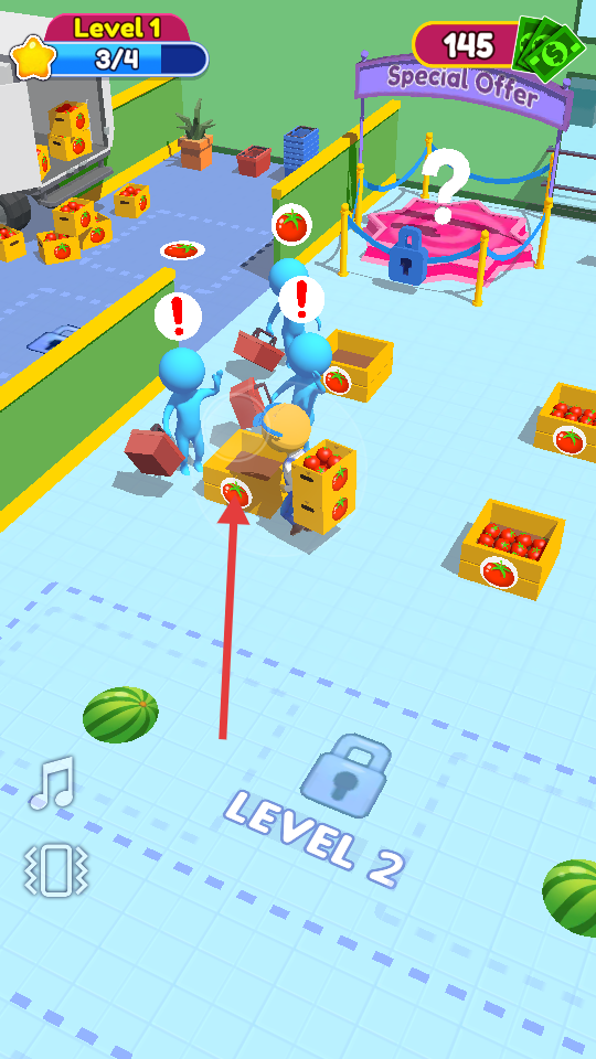 2、搬運好番茄箱后,會有藍色小人出現,他們有購買需求,需把番茄箱提供給這些小人,滿足他們的需求助力超市運營。