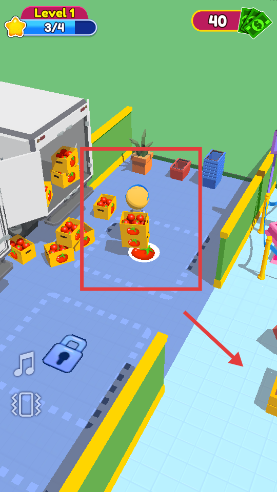 1、游戲開始時要搬運貨車上的番茄箱,將其放到指定位置,這是開展后續超市經營的基礎,完成搬運可推進關卡進度。