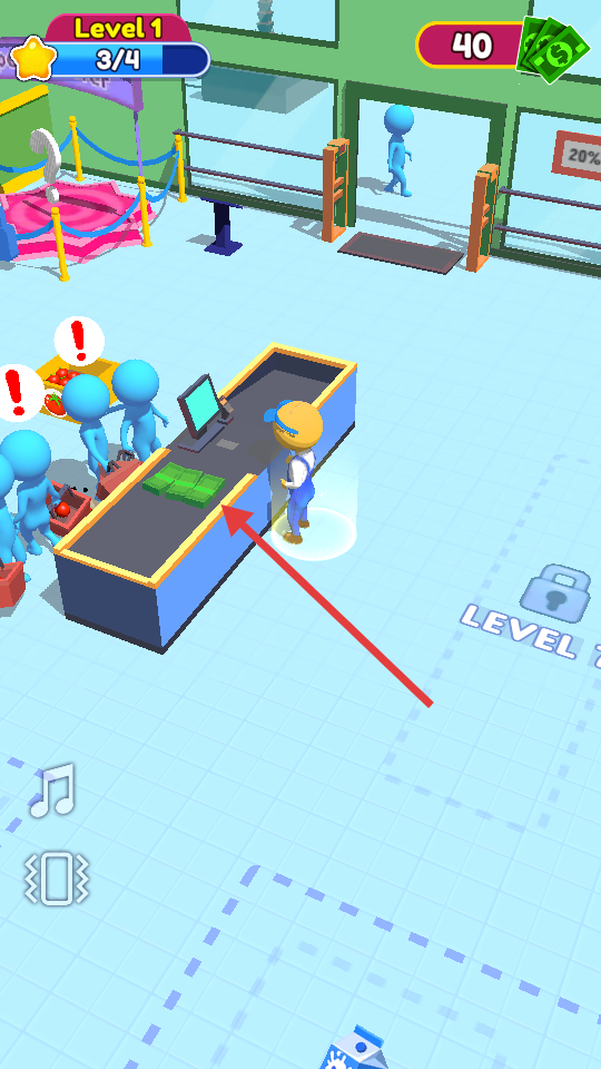 3、當藍色小人有購買動作后,操控角色到收銀臺處進行收銀操作,玩家收取相應的錢款,積累超市的資金用于后續發展。