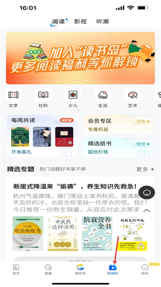4、悅視聽板塊,分閱讀、影視等分類,有每周共讀活動,含海量正版影視資源,免費提供閱讀、觀影等多媒體服務。