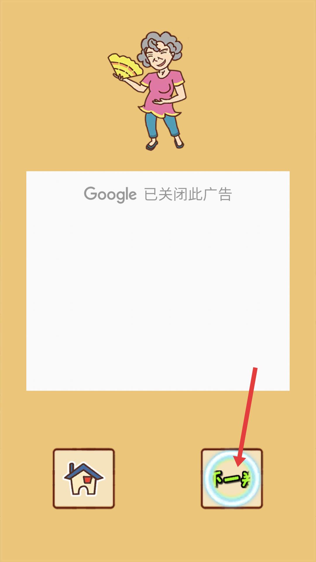 4、遇到廣告界面時,等待廣告關閉后,點擊下一步按鈕,可繼續推進游戲,進入后續的游戲環節或關卡。