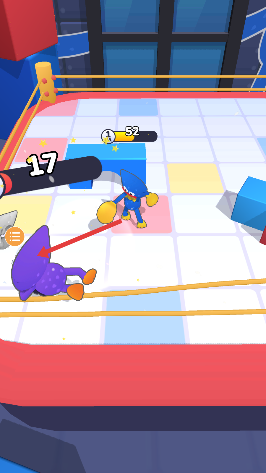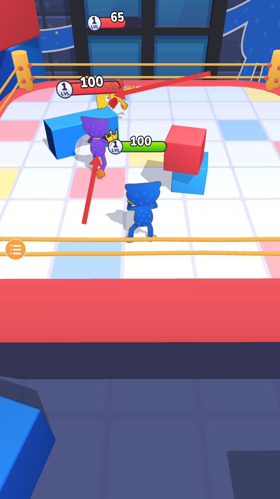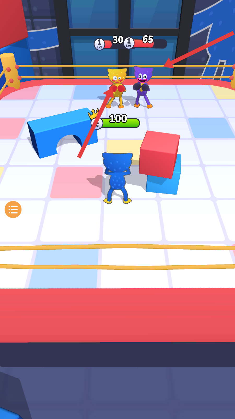 1、進入游戲,在擂臺場景上,操控角色移動,與其他角色展開拳擊對抗,利用場景中的方塊等元素,助力戰斗。