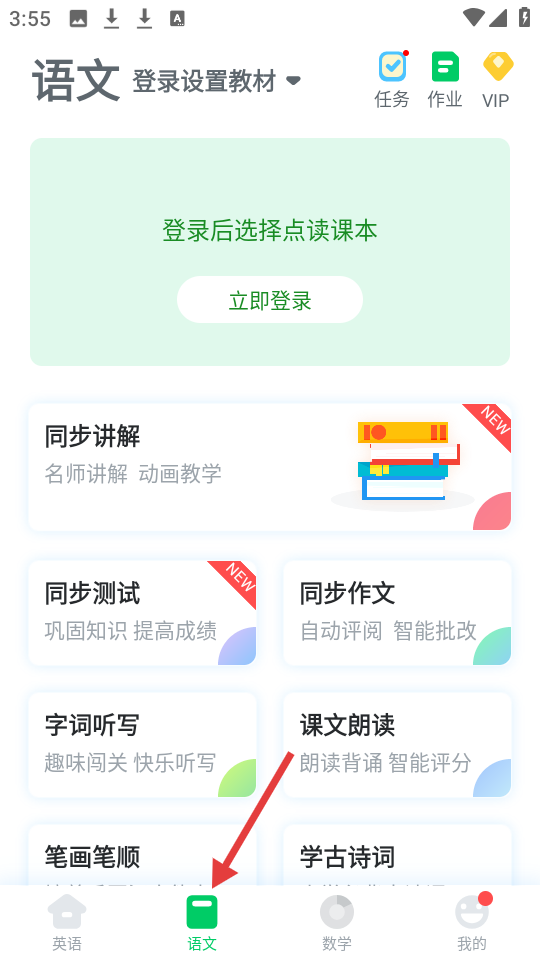 1、首頁提示登錄后選點讀課本,設有同步講解、字詞聽寫等功能,覆蓋名師動畫教學與趣味學習模式。