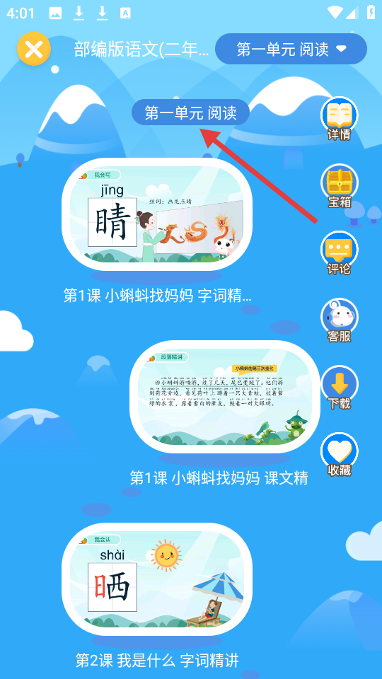 2、二年級語文頁面聚焦第一單元閱讀,包含字詞和課文精講,還提供詳情查看、評論等互動功能。
