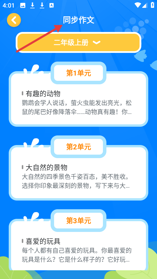 3、同步作文頁面針對二年級上冊,展示多單元作文主題,從有趣動物到喜愛玩具,支持自動評閱與智能批改。