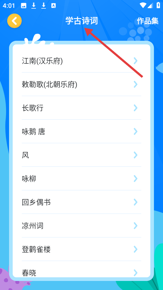 4、學古詩詞板塊呈現江南、詠鵝等經典詩詞列表,便于學生學習積累,右上角作品集可留存學習成果。