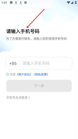 1、手機號輸入界面,提示輸入常用手機號以便聯系,需輸入號碼并同意用戶協議和隱私政策后進入下一步。