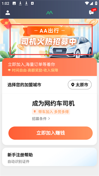 2、AA出行司機招募界面,可選擇加盟城市如太原市,成為網約車司機帶車加入多勞多得,還有新手注冊幫助。