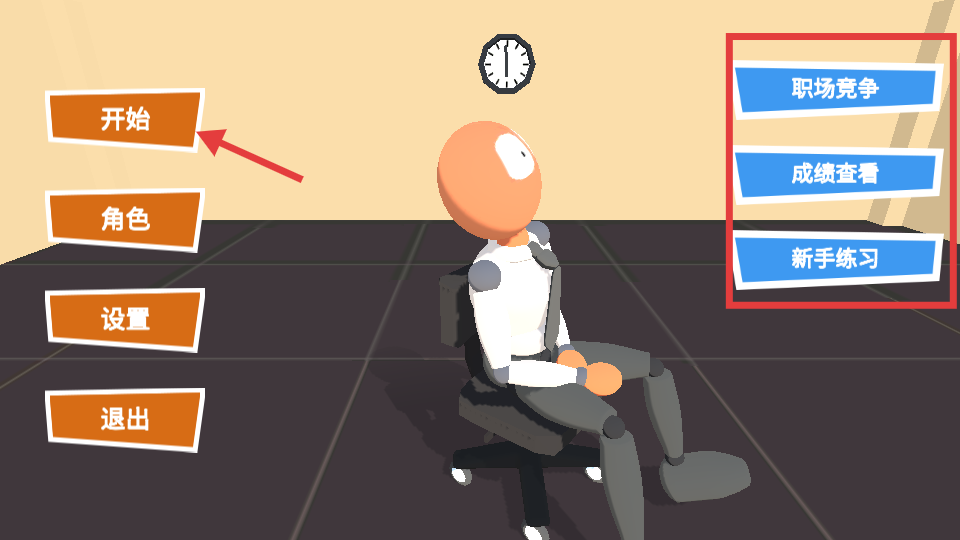 1、進入游戲主界面,玩家點擊開始即可進入闖關模式,若為新手可點擊右側新手練習熟悉操作,想參與競爭就選職場競爭,還能通過成績查看了解過往表現。