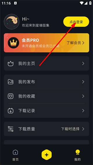 2、我的頁面能看到歡迎提示及點此登錄按鈕,還有會員PRO板塊、我的主頁等功能選項,點擊點此登錄按鈕,即可進入登錄選擇界面。