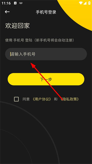 4、選擇手機號登錄后進入手機登錄頁面,需輸入手機號,勾選同意用戶協議和隱私政策,之后點擊下一步,即可繼續完成登錄流程。
