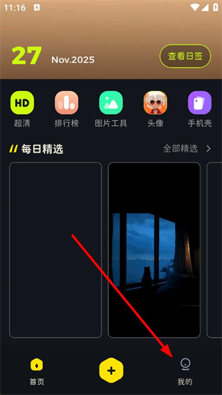1、進入應用首頁,可看到日期顯示及超清、排行榜等功能入口,還有每日精選內容展示,底部有首頁、加號、我的功能按鈕,點擊我的可進入個人頁面。