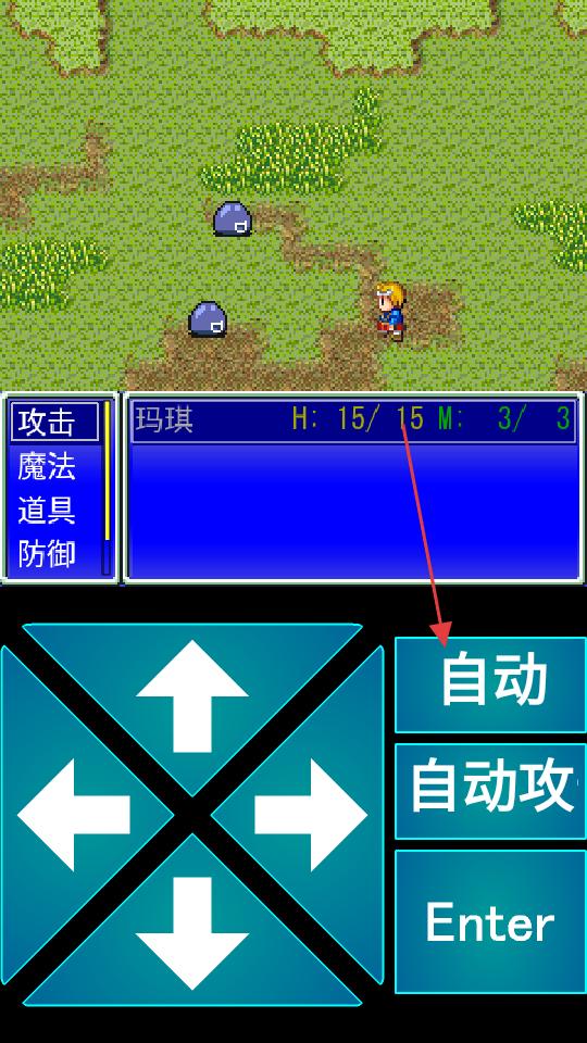3、戰斗時選【自動】或手動操作,合理用攻擊、魔法,留意血量魔力,擊敗怪物推進劇情,解鎖新區域。