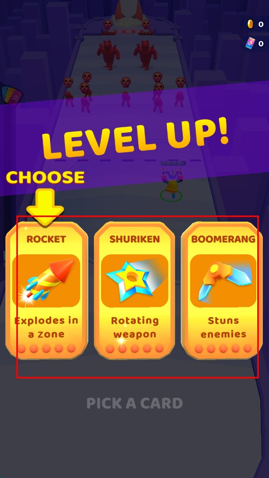 4、升級時會出現火箭、手里劍、回旋鏢三種武器選擇,火箭能區域爆炸,手里劍是旋轉武器,回旋鏢可眩暈敵人,選其一增強戰力。
