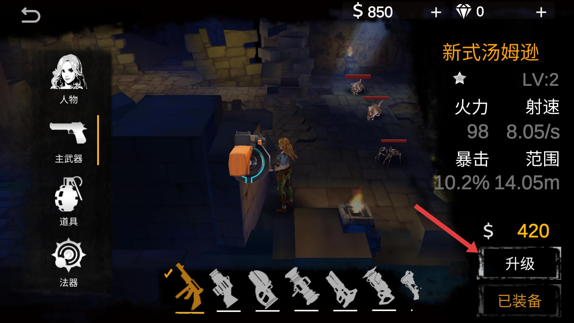 4、可消耗420美元點擊【升級】按鈕,提升武器的火力、射速等屬性,增強戰斗能力。