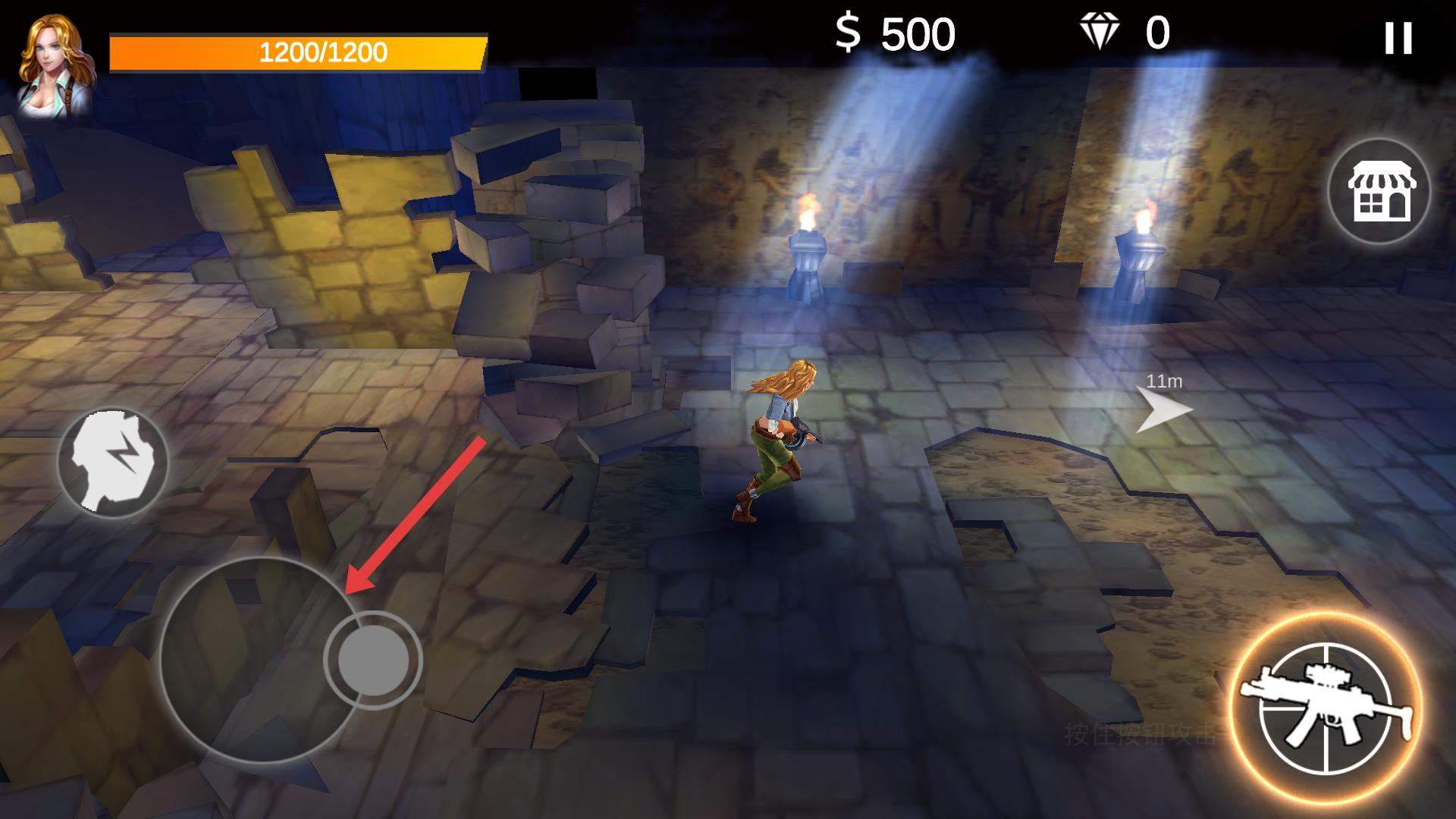 2、通過左側的虛擬搖桿操控角色移動,在古老的建筑廢墟中穿梭,尋找目標位置,推進冒險進程。