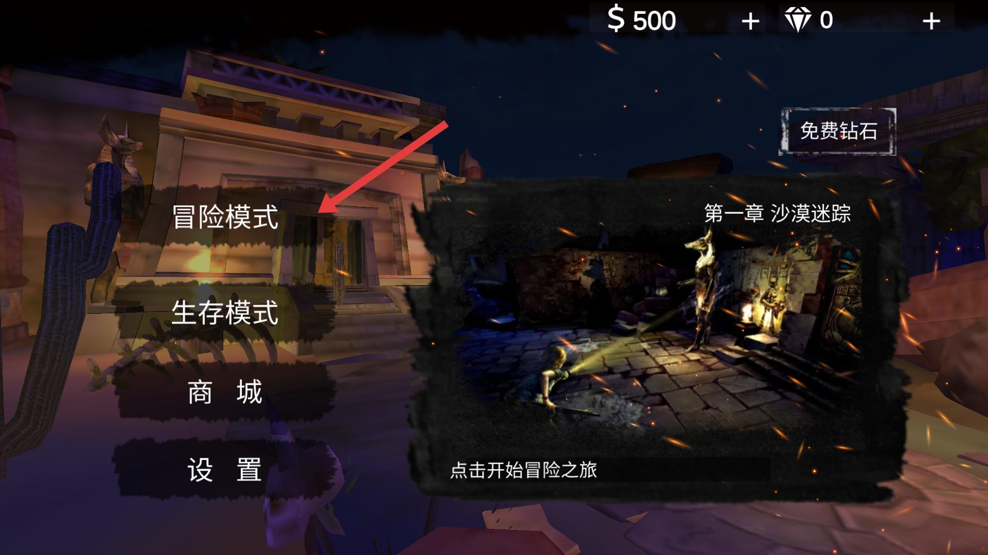 1、選擇【冒險模式】,開啟冒險之旅,在神秘的沙漠場景中探索,迎接各種挑戰。
