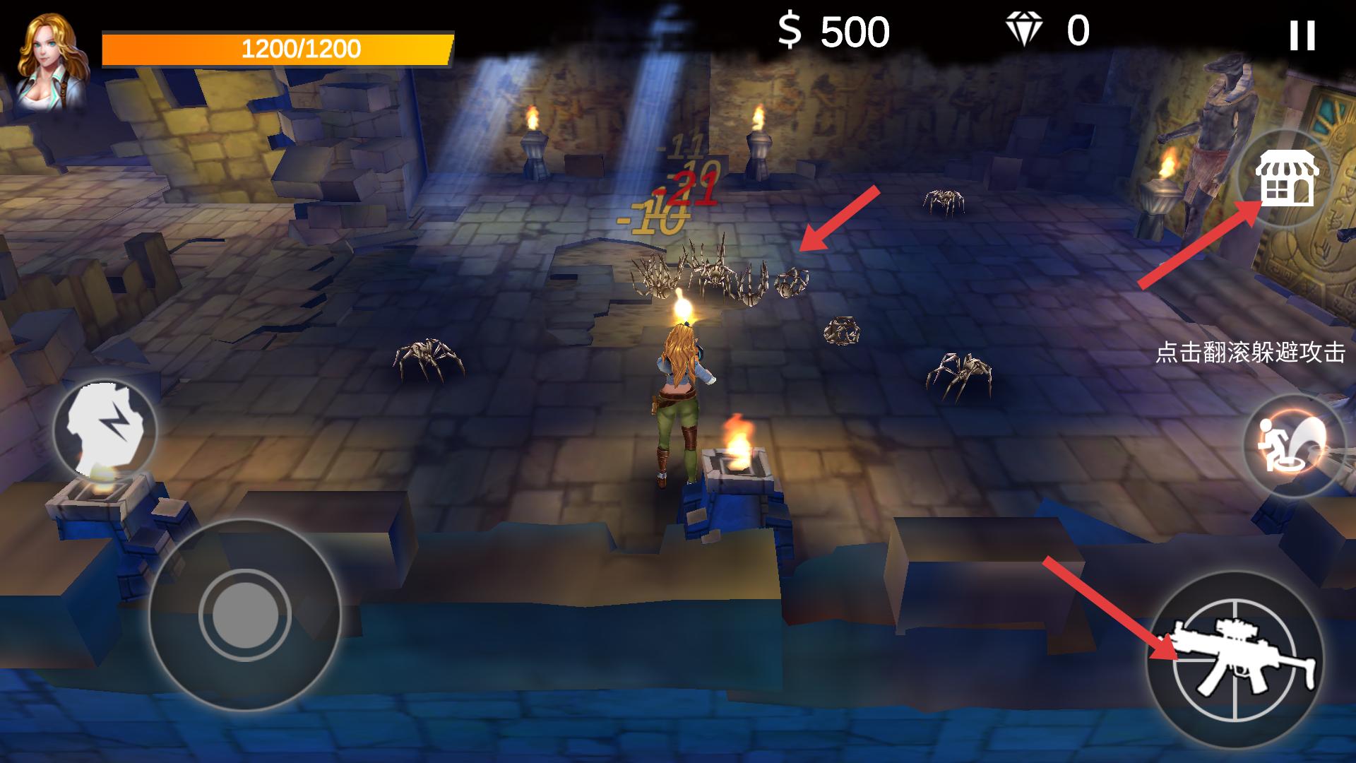 3、遇到蜘蛛等怪物時,點擊右側的攻擊按鈕射擊,若怪物攻擊,可點擊翻滾按鈕躲避,同時也能進入商店補充物資。