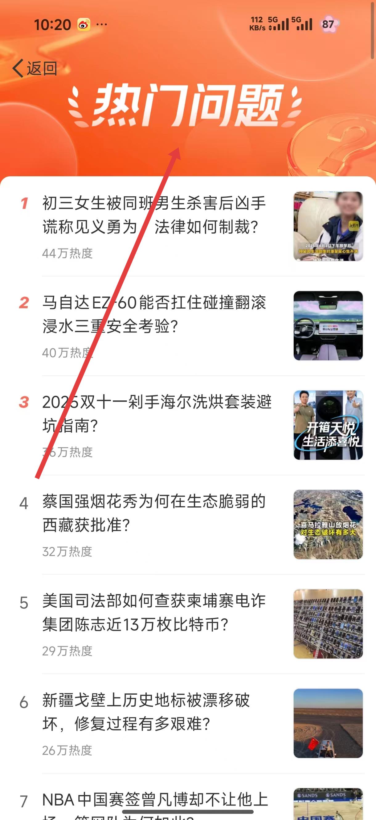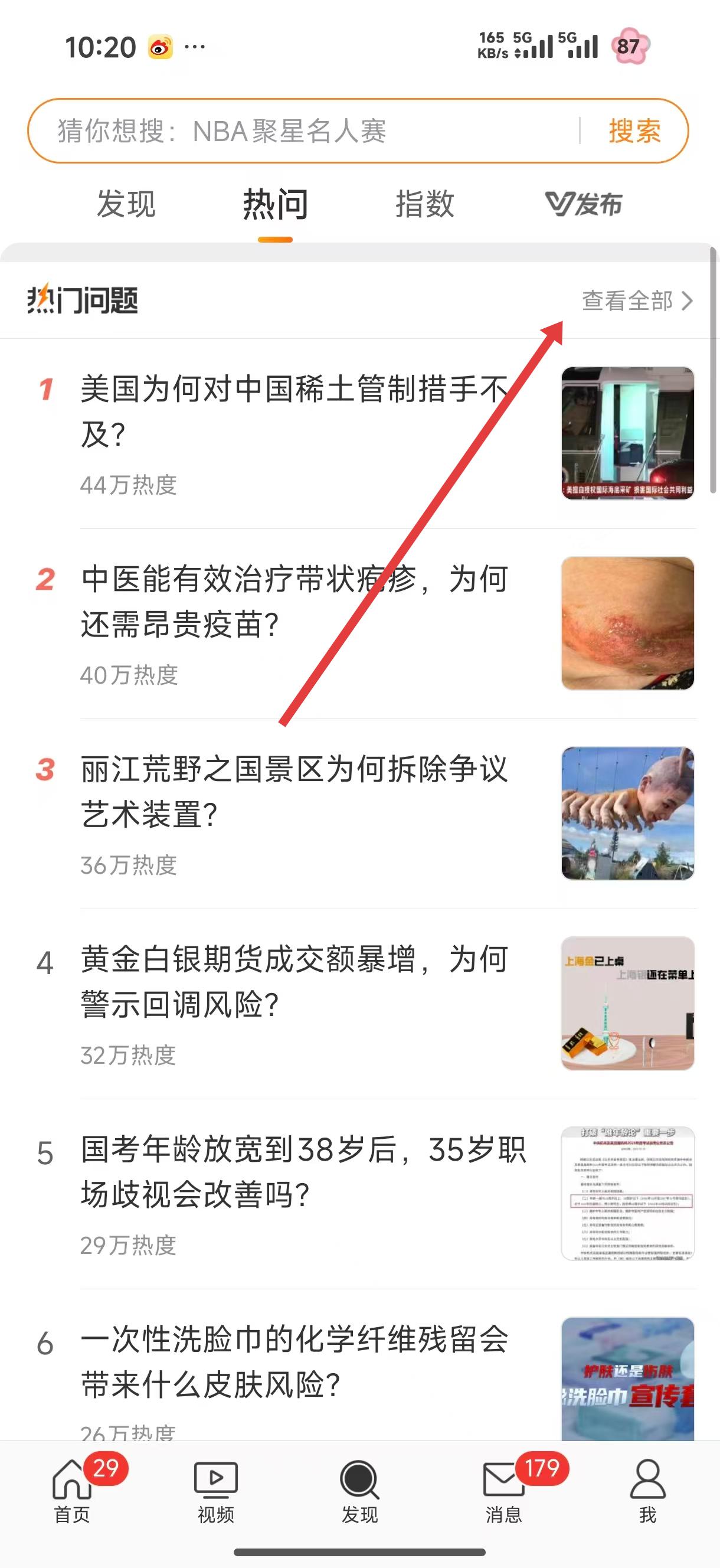 1、打開微博APP,進入熱問頁面,看到查看全部按鈕,點擊該按鈕,進入熱門問題完整列表頁面。