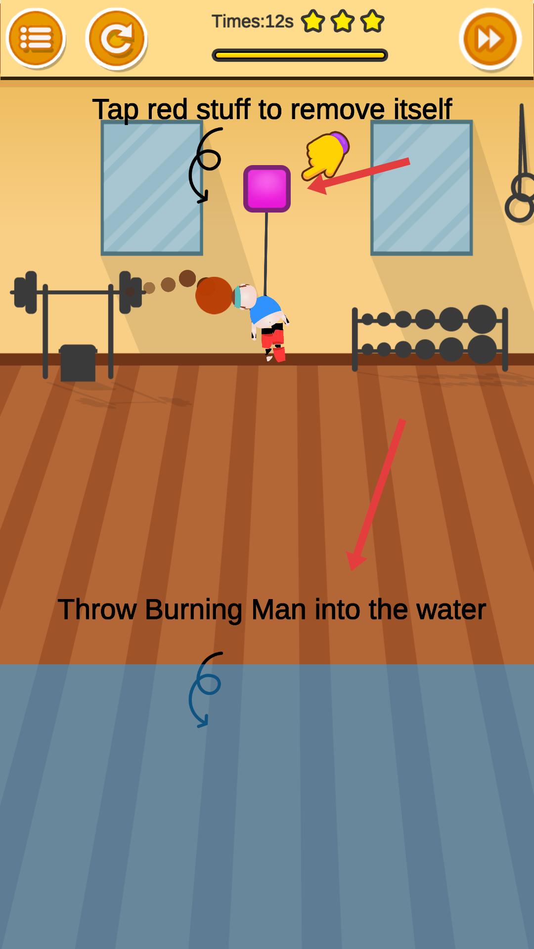 2、進入游戲后,按照提示點擊紅色方塊,使其消失,然后想辦法將燃燒的角色扔進水里,完成這一關卡的任務。